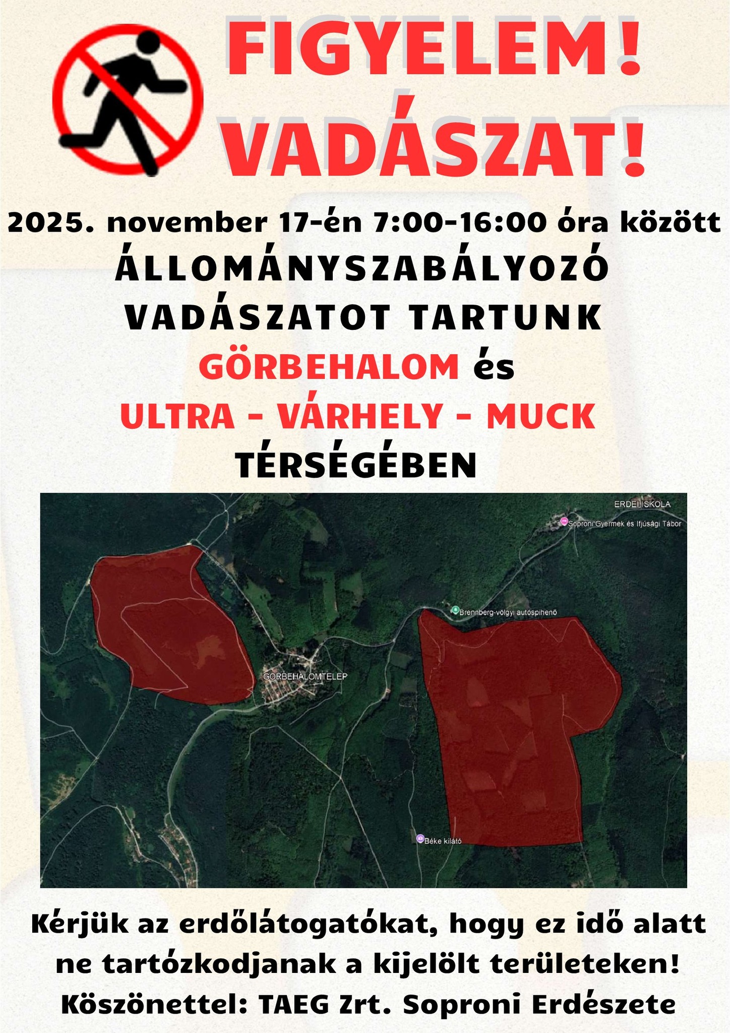 2025. november 17-én 7:00-16:00 óra között állományszabályozó vadászatot tart a TAEG Zrt. Soproni Erdészete Görbehalom, valamint Ultra-Muck-Várhely térségében. Kérjük az erdőlátogatókat, hogy ez idő alatt ne tartózkodjanak a kijelölt területeken! Köszönettel: TAEG Zrt.