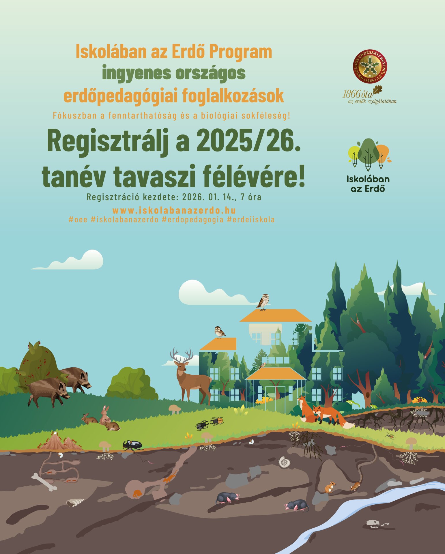Tudod-e mi a különbség a hernyó, a nyű, a pajor és a pondró közt? Szerinted mi történne, ha eltűnnének a gombák az erdőből? 2026. január 14-től regisztrálhatnak a hazai köznevelési intézmények az Iskolában az Erdő Program újabb ütemére, amelyben az Országos Erdészeti Egyesület által minősített Erdészeti Erdei Iskolák erdőpedagógusai maximum 30 fős csoportoknak, osztályoknak tartanak országszerte, ingyenes tematikus foglalkozásokat.